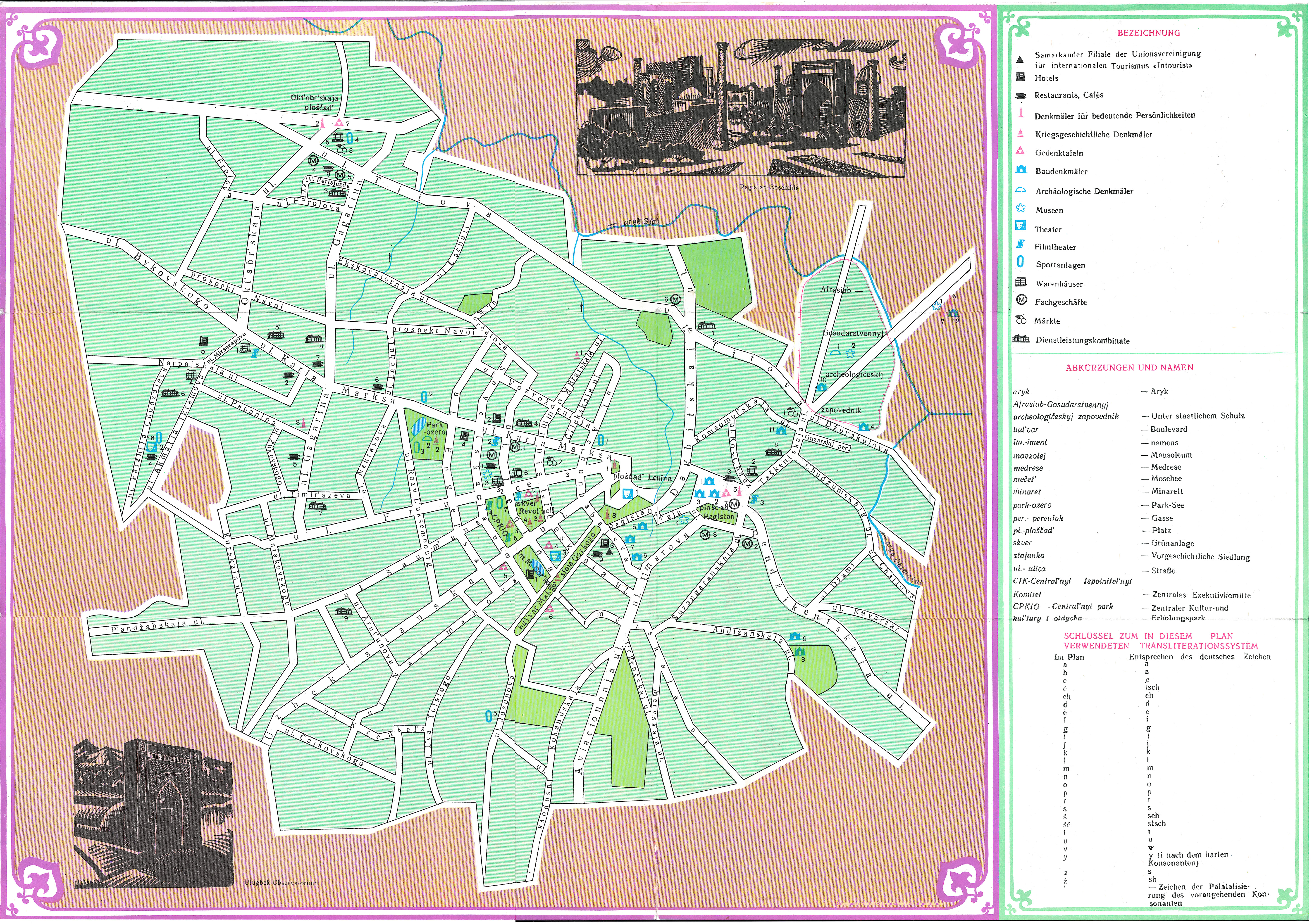 Местные жители не привыкли ориентироваться в городе по адресам. Вместо этого используются ориентиры. Раньше город делился на районы, но потом административное деление упразднили. Многих ориентиров уже не существует физически, но каждый самаркандец знает, о чем идет речь. Я, как релокант, могу ошибаться или упустить какой-то топоним. Буду очень благодарен, если старожилы помогут разобраться во всех тонкостях, написав сюда.